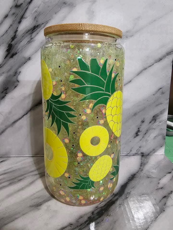 "Pineapple" design comes with bamboo lid & reusable straw. Polymer clay pineapple slices. Item sold as is.